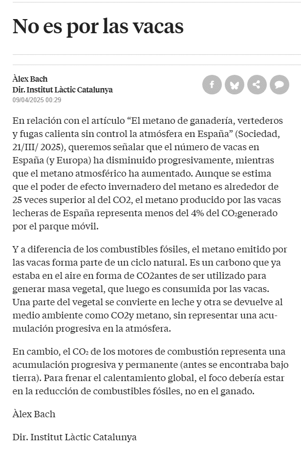 Desde el Institut Làctic de Catalunya leímos un artículo publicado el sábado 21 de marzo en LaVanguardia sobre “El metano de las vacas” que queremos matizar. El artículo aborda un problema muy importante para el planeta: el calentamiento global. Pone el foco en el metano producido por las vacas y da a entender que éste es el gran causante del cambio climático.